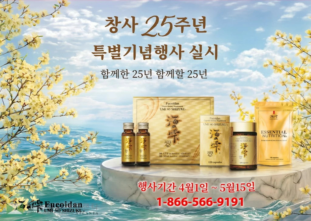 미주 한인들의 건강 파수꾼으로 자리매김한 ‘우미노 시즈쿠 후코이단’이 창사 25주년을 맞아 고객 감사의 마음을 담은 ‘빅 사은 이벤트’를 개최한다.