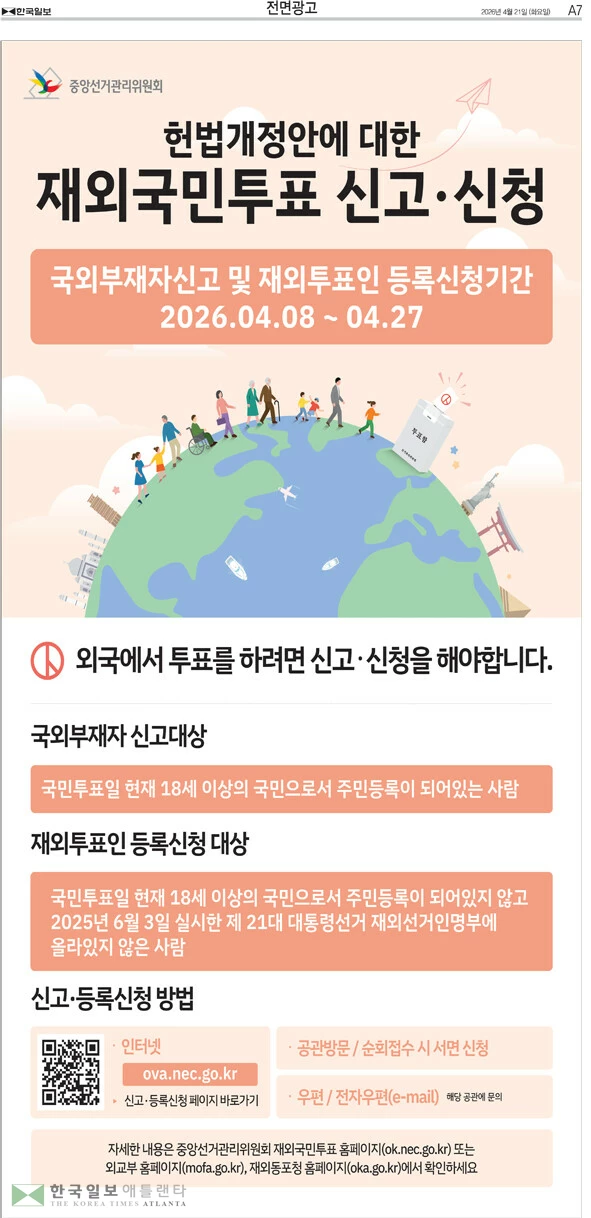 총영사관은 지난 4월7일 공고된 헌법개정안에 대한 재외국민투표의 국외부재자 신고 및 재외투표인 등록신청을 오는 4월27일까지 접수하고 있다고 20일 밝혔다. 총영사관 측은 “인터넷과 총영사관 방문, 이메일 등으로 투표 등록을 할 수 있으나, 재외국민투표의 일정상 신고·신청 마감일이 얼마남지 않아 재외국민투표 인터넷홈페이지(ova.nec.go.kr)를 이용하는 방법이 가장 편리할 것”이라고 설명했다.