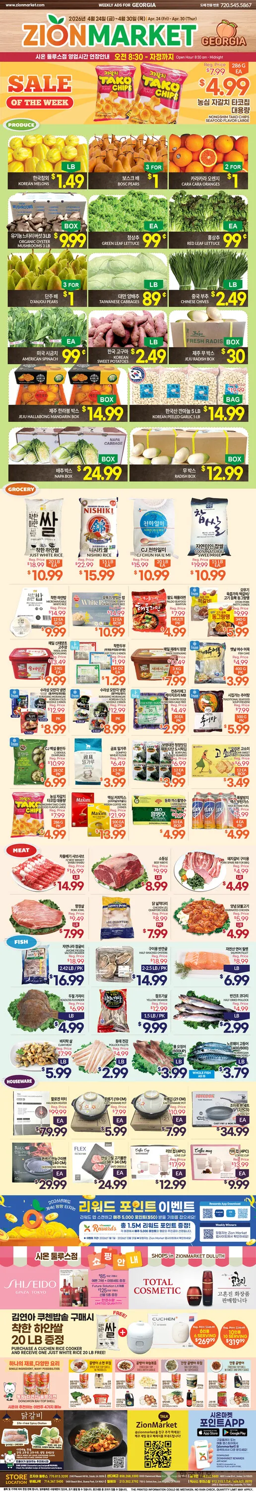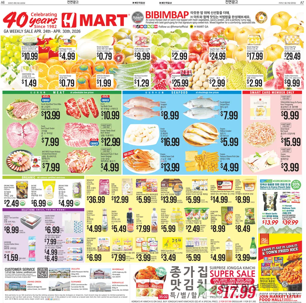 그로서리 코너에서는 화성 수향미 골드퀸 3호 22LB(10KG) EA 36.99, 자연담은 찹쌀 15LB EA 12.99, 삼양 핵불닭볶음면 멀티 4.94OZ (140G)/EA 5.99, 농심 태경 컵잡채 3.63 OZ (103G)/6 EA13.99,청정원 순창 찰고추장 6.6LB EA 14.99, 청정원 조개멸치 찌개된장 1.98LB(900G)EA 8.99, 샘표진간장 금S 60.3OZ(1.8L)EA 5.49, CJ 백설 남해굴소스(상온) 12.35OZ EA 4.99,사조 참치액 1.98LB(900G) EA 7.99, 오뚜기 양조식초 1.8L EA 5.99, 청정원 들기름 바사삭김 재래 도시락 16팩 4G/16PK EA 5.99, 오뚜기 옛날 미역 250G EA 8.49, 비비고 떡볶이 컵 오리지널 4.4OZ(125G) EA 2.49에 판매된다.