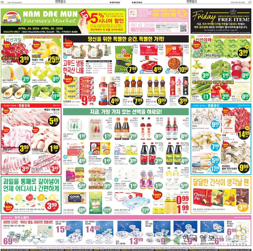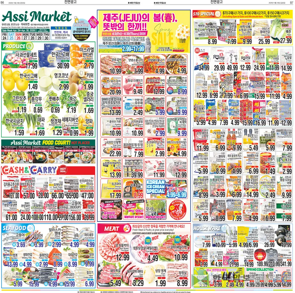 과일 코너에서는 (금/토/일 한정)한국 참외 박스 24.99,캘리포니아 청매실 lb 10.99,제스프리 레드키위 프리미엄 pk 5.99,한국산 세척사과 ea 1.29,한국산 신고배 3pc 6.99,제주 천혜향 bag 9.99,제주 한라봉 백 7.99,레드 망고 박스 6ct box 11.99에 판매된다.