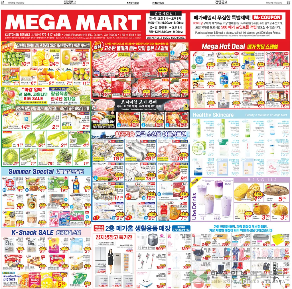 그로서리 코너에서는 착한 하얀쌀 20LBS EA 10.99,니시키 쌀15LBS EA 15.99, CJ 천하일미 20LBS EA 10.99, 자연미인 찹쌀15LBS EA 10.99, 착한 하얀밥12 EA BOX 9.99, 오뚜기 맛있는 밥12 EA BOX 10.99, 팔도 해물라면 MULTI PK 4.99,수라상 모란각 열무 비빔냉면2.38 LB PK 18.99, 오뚜기 육즙가득 떡갈비340G PK 5.99, 오리온 고소미12 EA BOX 3.49,농심 자갈치 타코칩 대용량286G PK 4.99,곰표 밀가루 2.5KG PK 3.99, CJ 백설 물만두28OZ PK 6.99,옛날 여수 어묵400G PK 3.99, 매일 신태양초 고추장 3KG EA 9.99, 시집가는 추어탕500GPK 5.99, 보령대천 청정맛김 재래 12단 도시락김12 EA PK 3.99, 컨츄리에그 케이지프리 MB 20CT PK 2.99, 동화 까스활명수10 EA BOX 4.99,착한두부14OZ EA1.2, 폭발방지 맥스 부탄가스4 EA PK 4.99에 판매된다.