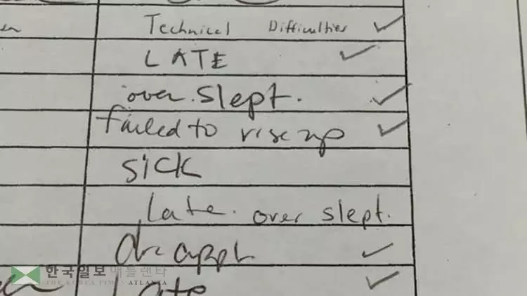 그레이터 애틀랜타 크리스턴 스쿨 월요일 지각 사유 기록. <사진=학교 페이스북>