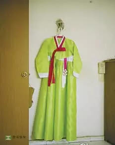 수상작에는 진분홍색 고름으로 장식된 연둣빛 치마, 저고리 한복이 낡은 방 한편에 곱게 걸려 있다.