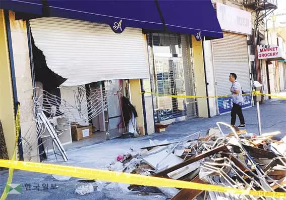 2일 오전 4시30분께 LA 다운타운 패션 디스트릭트에서 약물에 취한 운전자가 몰던 차량이 한인 의류업소로 돌진해 업소가 큰 피해를 입었다. 차량 운전자는 아시아계로 가벼운 부상만 입은 것으로 알려졌다. <박상혁 기자>