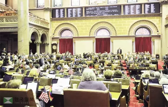 뉴욕 주상원이 9일 2017~18 회계연도 잠정 예산안에 대한 심의를 하고 있다.