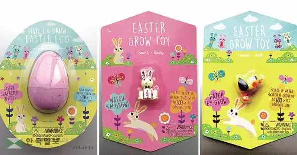 해당 제품은 '해치 & 그로우 이스터 에그'(Hatch & Grow Easter Eggs), '이스터 그로우 토이스'(Easter Grow Toys), '해치 유어 오운 디노'(Hatch Your Own Dino)<사진 참조> 등이다. 이들 장난감은 물에 담그면 원래 크기보다 6배 커진다.