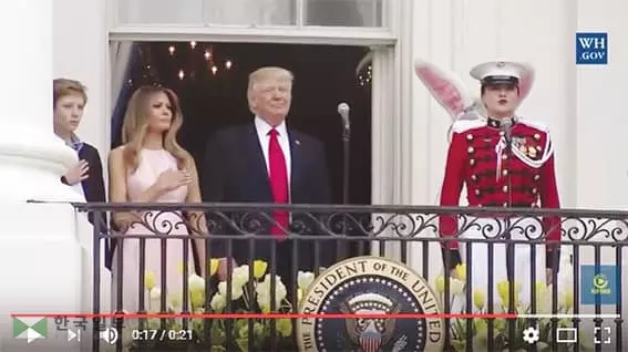 17일 백악관 공식 웹사이트에 올라온 부활절 에그롤’ 행사 공식 동영상 중 하나인데, 트럼프 대통령 내외와 막내 아들 배런은 전날 백악관 남쪽 잔디광장에서 열린 이 행사에서 미국 국가가 연주되자 멜라니아 여사와 배런은 약속이나 한 듯 동시에 가슴에 손을 올렸다.