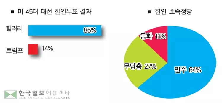 아시안 아메리칸 법률교육재단(AALDEF)이 18일 발표한 ‘2017 대통령 선거 아시안 유권자 출구조사’ 보고서에 따르면 힐러리 클린턴 후보를 찍었다고 밝힌 한인 유권자는 무려 85%에 달했다. 이는 전체 아시안 유권자 79%보다 6% 포인트 높은 것이다.