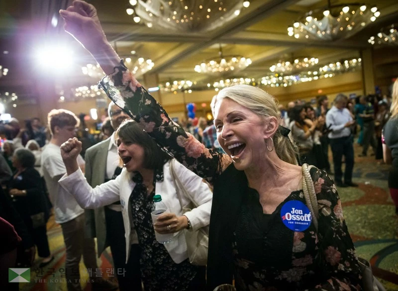 19일 새벽 민주당 오소프 후보가 과반에 가까운 득표율을 보이자 지지자들이 환호하고 있다.