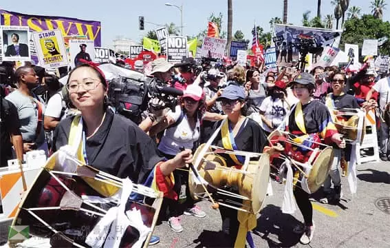 지난 1일 세계 노동자의 날인 ‘메이데이’를 맞아 전국에서 기념 행사가 열린 가운데 LA 다운타운과 한인타운 등지에서도 트럼프 행정부의 반이민 정책 반대와 이민자 권리 보장을 요구하는 집회가 10여년만에 최대 규모로 진행됐다. 한인타운에서 한인단체들이 장구 등을 치며 퍼레이드를 하고 있다.