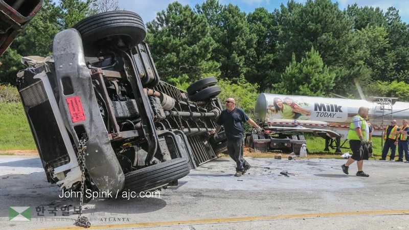 12일 오전 316고속도로 귀넷 구간인 하빈스 로드 인근에서 대형우유탱크를 싣고 달리던 트럭이 추돌로 인해 전복되는 사고가 일어났다. 이 사고로 4만 8,000갤론상당의 우유가 도로에 쏟아져 큰 혼란이 일어났다. 이번 사고는 한 박스트럭이 갑자기 전복되면서 5중추돌사고로 이어졌다. 7명의 부상자 중 2명이 병원으로 이송됐지만 생명에는 지장이 없는 것으로 전해졌다. 전복된 우유트럭과 박스트럭 주변 도로에 쏟아진 우유가 가득하다. 이우빈 기자