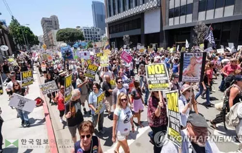 트럼프 대통령 탄핵 촉구시위를 하고 있는 LA시민들.