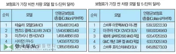 이와는 달리 보험료가 싼 모델들은 차량의 대부분은 SUV와 밴 등이 차지했다. 보험료가 가장 싼 모델로 조사된 스바루 아웃백의 경우 연평균 보험료는 539달러32센트에 불과했다.