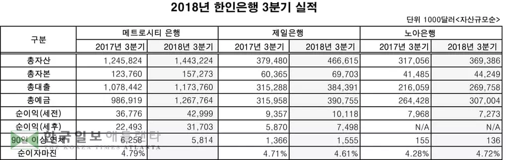 애틀랜타 한인은행들이 2018년 3분기에도 견고한 성장세를 이어갔다.