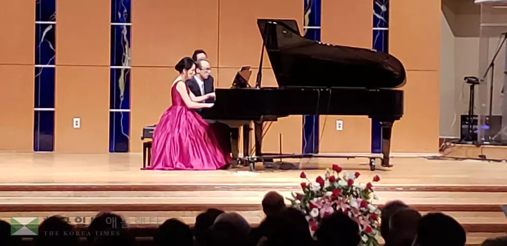 4일 열린 한미장학재단 남부지회 기금마련 음악회에서 함혜은-조시아 스토커 피아노 듀오가 연주하고 있다.
