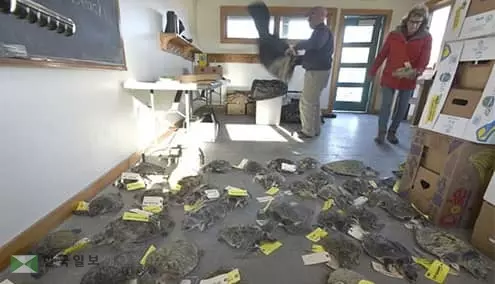 북동부 지역에 예년보다 강한 추위가 닥친 가운데 매사추세츠주의 코드 곶에서 지난 23일 바다거북 190여 마리가 얼어 죽은 채 발견됐다.