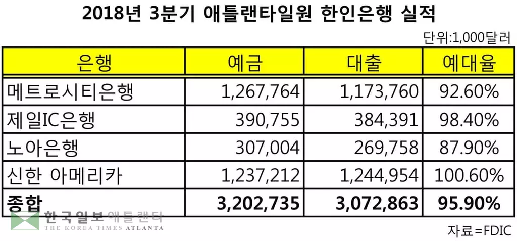 조지아주에서 영업하는 4개 한인은행들이 연방예금보험공사(FDIC)에 보고한 실적에 따르면 2018년 3분기(9월30일) 현재 4개 한인은행들의 총 예금고는 32억274만달러, 대출은 30억7,286만달러로 예대율이 95.9%에 달했다. 100%를 상회한 신한 아메리카를 제외한 메트로시티, 제일IC, 노아은행 등의 애틀랜타 토종은행들은 작년에 비해 예대율이 크게 개선됐다.