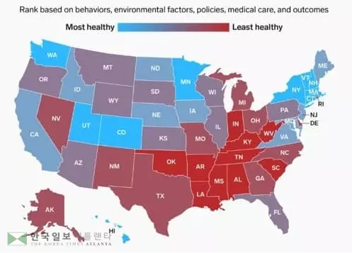 미국의 성인 비만 인구 비율이 사상 처음 30%를 넘어선 가운데 주민 건강 상태는 주마다 큰 편차가 있는 것으로 나타났다. 조지아 주민의 건강상태는 전국 39번째로 평가됐다.