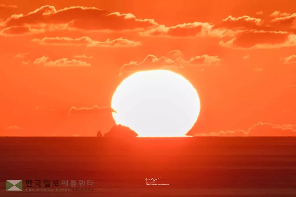 한국 울릉도에서 본 독도 일출 광경. 태양이 어둠을 뚫고 수평선 위로 솟아 오르며 온누리를 붉게 물들이고 있다. 붉고 힘차게 떠오르는 태양의 기운이 애틀랜타 한인사회에도 구석 구석 퍼져 2019 기해년 한인들의 삶도 행복하기를 기대한다. <사진=독도 전문 사진작가 이정호>