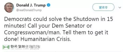 트럼프 “민주당이 전향적 태도를 보이면 셧다운 사태는 15분만에 해결될 수 있다” 협상 압박<사진=트럼프 대통령 트위터 캡처>
