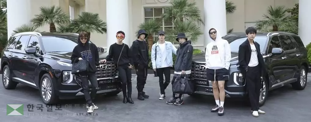 현대차는 방탄소년단의 '2019 빌보드 뮤직 어워즈' 시상식 참석 등의 미국 일정을 위해 대형 스포츠유틸리티차(SUV) 팰리세이드를 제공했다고 1일 밝혔다. 방탄소년단은 지난달 29일 라스베이거스 공항을 통해 입국하고서 시내로 이동할 때 팰리세이드를 탔다.지난달 29일 숙소 앞에서 '팰리세이드'와 포즈를 취하고 있는 방탄소년단. <사진=현대차 제공>