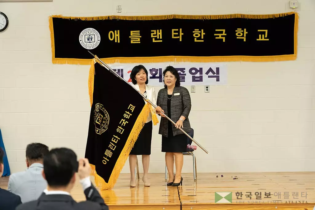 송미령(오른쪽) 전 애틀랜타 한국학교 교장이 김현경 신임교장에게 학교기를 건네고 있다.