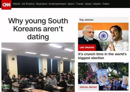 취업난 속에 주머니는 가볍고, 데이트폭력이나 불법촬영 등 성범죄의 두려움에 연애를 선뜻 시작하지 않거나 못하는 한국 청춘들의 모습이 CNN방송 홈페이지 메인에 등장했다.