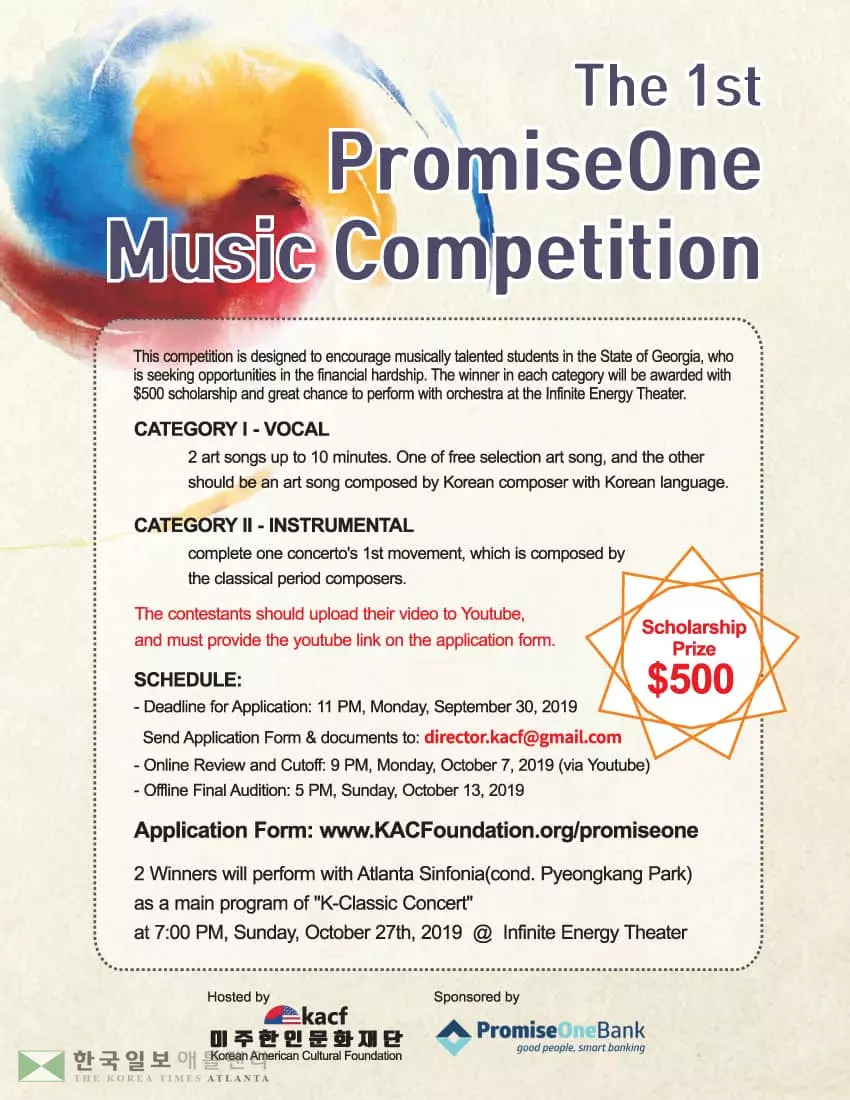 미주한인문화재단(KACF, 대표 최은주)은 프라미스원 뱅크(행장 제이크 박) 특별후원으로 ‘제1회 프라미스원 음악경연대회’를 개최한다. 조지아주 거주 고등학교, 대학 및 대학원생이 참가할 수 있는 이번 콩쿨은 성악과 기악 부문으로 나눠 모집한다.