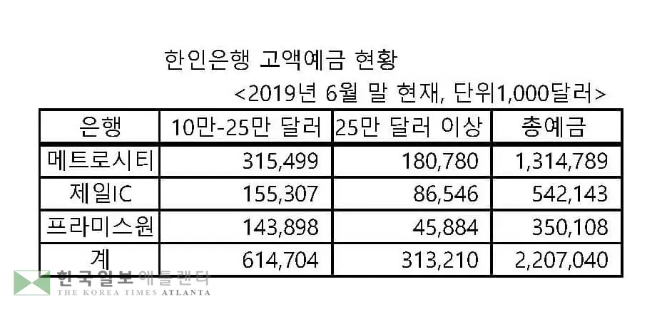 연방예금보험공사(FDIC)가 발표한 2019년 6월 말 자료에 따르면 애틀랜타에 본사를 두고 있는 3개 한인은행에 10만 달러 이상의 고액예금 규모는 모두 9억2,852만 달러로 집계됐다. <표 참조> 이는 3개 은행의 총예금 18억3,728만 달러의 42.0%에 해당되는 규모다. 지난해 같은 기간 10만 달러 이상 고액예금 비중은 45.9%였다. 1년 새 고액예금이 전체예금에서 차지하는 비중이 3.9%포인트 감소한 것이다. 10만 달러에서 25만 달러 미만 예금 비중은 지난해 보다 2.1%포인트 늘었지만 25만 달러 이상 예금비중이 무려 6%포인트 감소했다.