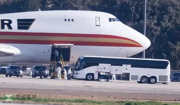 신종 코로나 바이러스 감염증의 발원지인 중국 우한에서 전세기 편으로 철수한 미국인 194명이 29일 리버사이드 카운티의 마치 공군기지에 도착해 3일간의 정밀 검사에 들어갔다. 중국 우한시 미 영사관의 직원들과 자녀들을 포함한 미국인들을 태운 전세기는 이날 오전 8시께 기지에 착륙했고 흰색 방역복 차림의 지상요원들과 3대의 대형 버스가 활주로에 대기하는 등 철저한 방역 속에 이들을 맞았다. [AP]