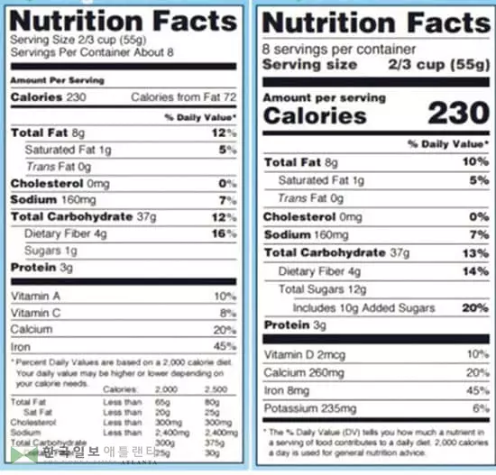 한국농수산식품유통공사(aT·사장 이병호)와 LA 총영사관(총영사 김완중)에 따르면 미국에서 유통되는 포장 식품의 새 영양 성분표(라벨링) 규정이 지난 1월부터 적용돼 시행되고 있다.