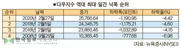 포인트 기준으로만 단순 비교하자면, 지난 2018년 2월 5일 하락 폭(-1,175포인트)을 웃돌면서 역대 최대 낙폭을 기록했다. 또한 다우지수는 2018년 2월27일 25,709.27포인트를 기록한 바 있어 2년전 수준으로 돌아간 셈이다.