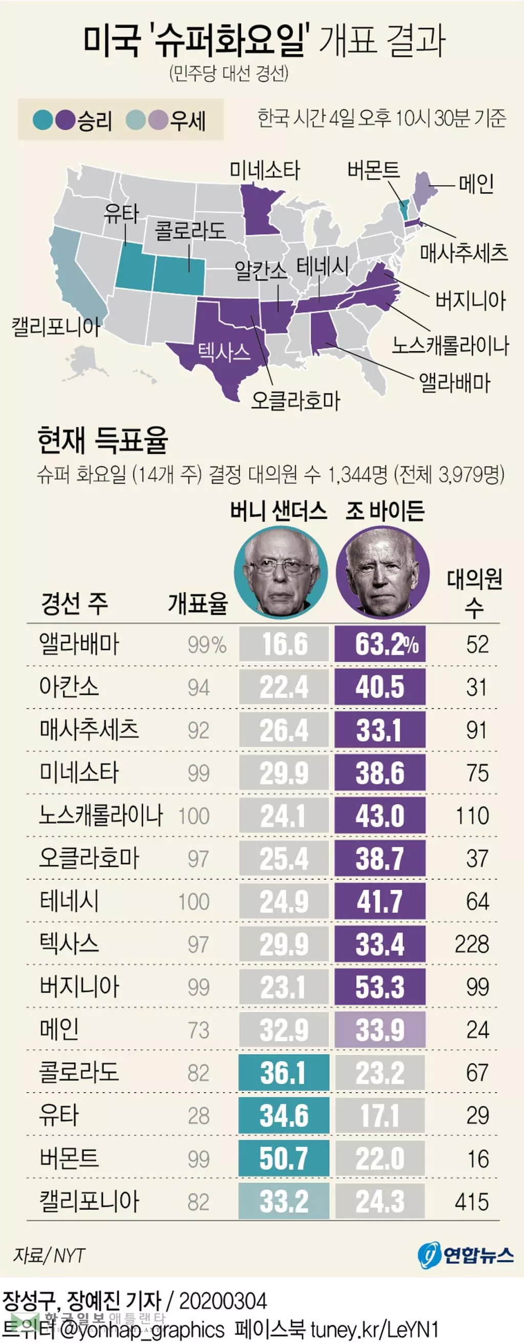 3일 14개 주에서 열린 '슈퍼화요일' 민주당 대선 후보 경선에서 조 바이든 전 미국 부통령이 10개 주에서 1위를 기록, 버니 샌더스 상원의원을 누르고 예상 밖의 대승을 거뒀다.