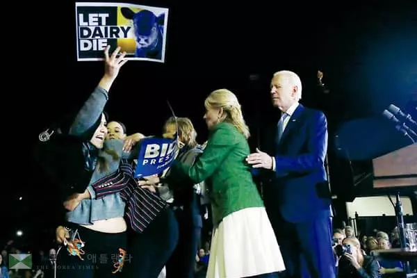 14개 주 중 10개 주에서 이긴 바이든 전 부통령이 LA 집회에서 승리 소감을 밝히던 중 연단 위로 두 차례 여성 시위자들이 난입하는 일이 발생했다. 이 두 시위자를 잇달아 막아낸 이가 바로 바이든의 아내 질이다.