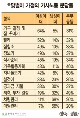 갤럽에 따르면 12가지의 가사 노동 과제 중 8가지에서 여성이 남성보다 더 많은 부분을 부담하고 있었다.