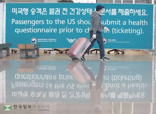 11일 0시(한국시간)부터 미국행 승객에 대한 출국검역제가 발효됐다. 이에 따라 인천공항에서는 미국행 항공기 탑승객들에게 3단계 발열 검사가 실시되며 감염 위험지역 방문 후 14일이 지나지 않은 미국행 승객들에 대해서는 탑승 차단조치가 내려진다. 이날부터 미국행 승객들은 발권 전 검역확인 증명이 포함된 건강상태 문서를 제출해야 항공기 티켓을 발권받을 수 있다. 10일 오후 인천국제공항 2터미널에 미국행 승객들의 건강상태 작성을 위한 별도의 공간이 설치돼 있다. [연합]