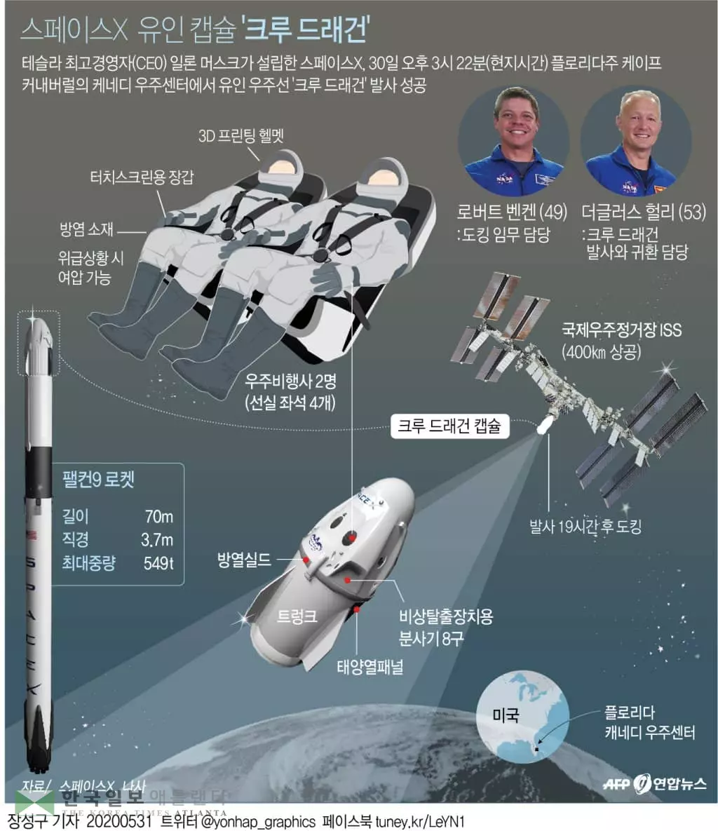 AP통신 등 외신에 따르면 미 동부 기준으로 전날 오후 3시 22분 2명의 우주비행사를 태운 채 플로리다주 케이프 커내버럴의 케네디 우주센터를 출발한 크루 드래건은 이날 수동 조정 없이 매끄럽게 자동 도킹에 성공했다.