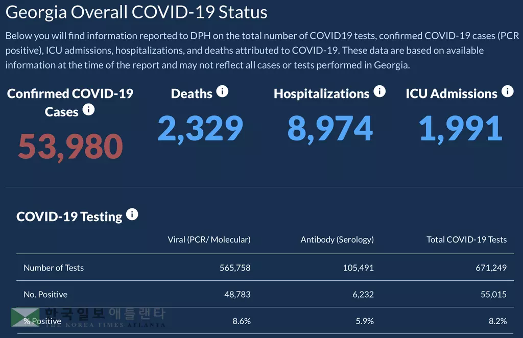 조지아주 보건부는 10일 오후 3시 현재 조지아주 코로나19 감염으로 인한 누적 사망자가 2,329명, 확진자가 53,980명이라고 발표했다. 확진자 치사율은 4.31%를 기록했다. 이는 9일 오후 3시 발표 보다 사망자가 44명, 확진자가 731명 늘어난 것이다. 감염자가 발생한 카운티는 159곳 전체에 이르렀다. 확진자 가운데 8,974명(16.62%)이병원에 입원했으며 중환자실(ICU) 입원환자는 1,991명이다.