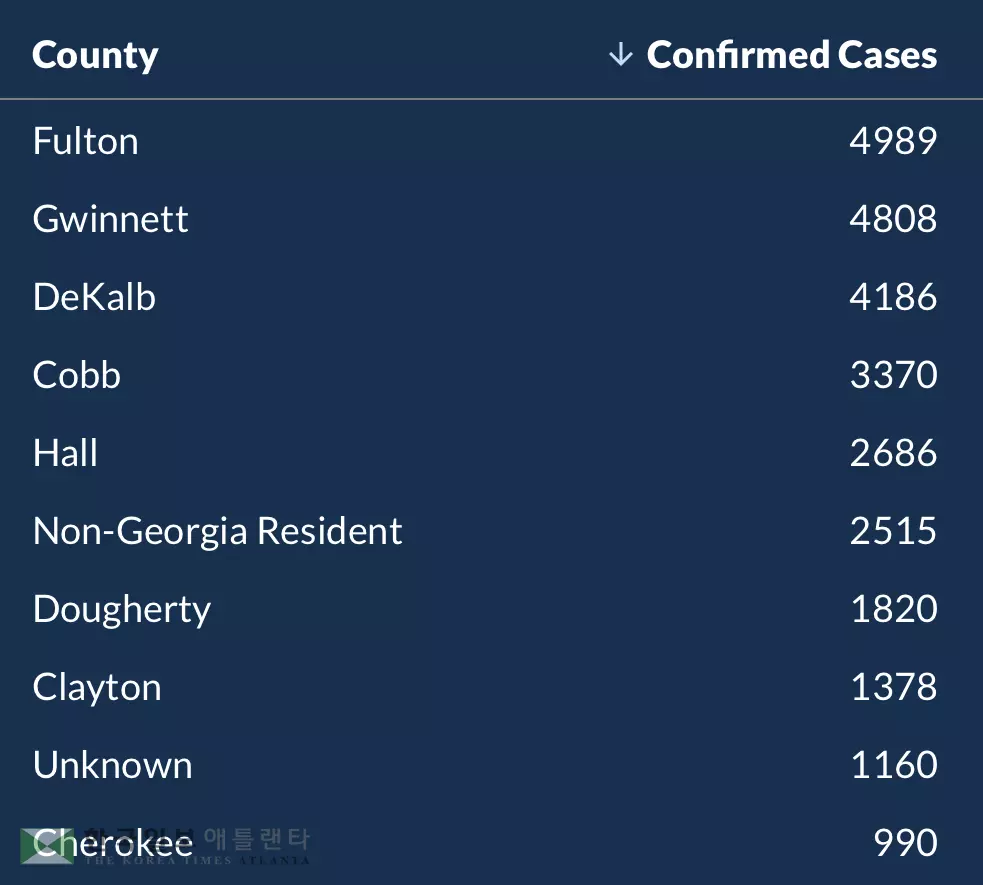 각 카운티별 감염자 수는 풀턴이 4,989명으로 가장 많았고, 귀넷 4,808명, 디캡 4,186명, 캅 3,370명, 홀 2,686명, 도허티 1,820명, 클레이턴 1,378명, 미상 1,160명이다.