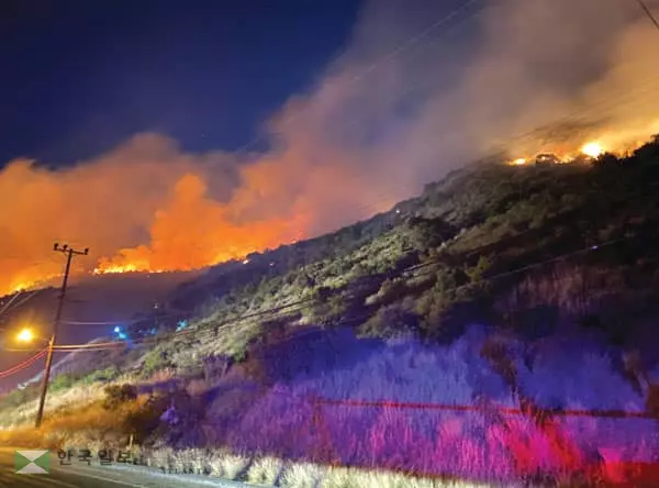남가주에 불볕더위가 이어지며 벨에어와 하시엔다하이츠 등 지역에서도 산불이 발생했다. 10일 0시15분께 405번 프리웨이 동쪽 게티센터 드라이브 인근에서 발생한 산불이 50에이커를 전소시켰으나 주택 등은 위협하지 않았다고 LA 소방국은 밝혔다. 이에 앞서 9일 밤에는 하시엔다하이츠 지역에서 15에이커를 태운 산불이 발생하기도 했다. 벨에어 인근 산불 현장에서 산등성이가 화염에 휩싸여 있다. [LA 소방국 제공]