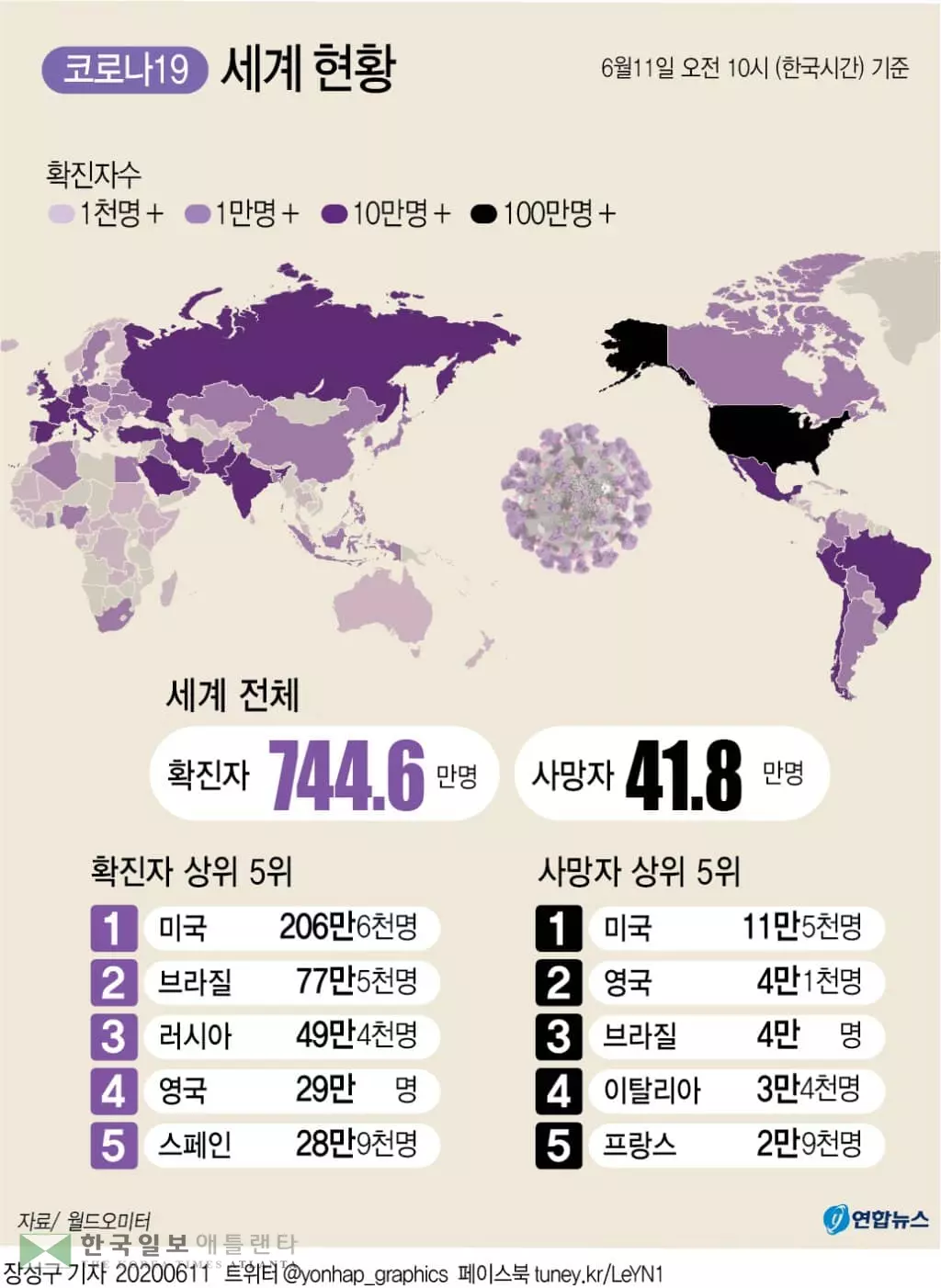 3위는 브라질로 3만9천680명, 4위는 이탈리아로 3만4천114명, 5위는 프랑스로 2만9천322명이 코로나19로 목숨을 잃었다.