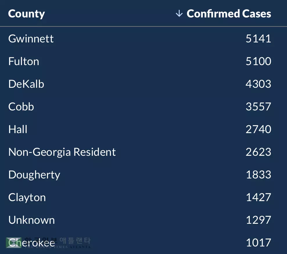 각 카운티별 감염자 수는 귀넷이 5,141명으로 가장 많았고, 풀턴 5,100명, 디캡 4,303명, 캅 3,557명, 홀 2,740명, 도허티 1,833명, 클레이턴 1,427명, 미상 1,297명, 체로키 1,017명이다.