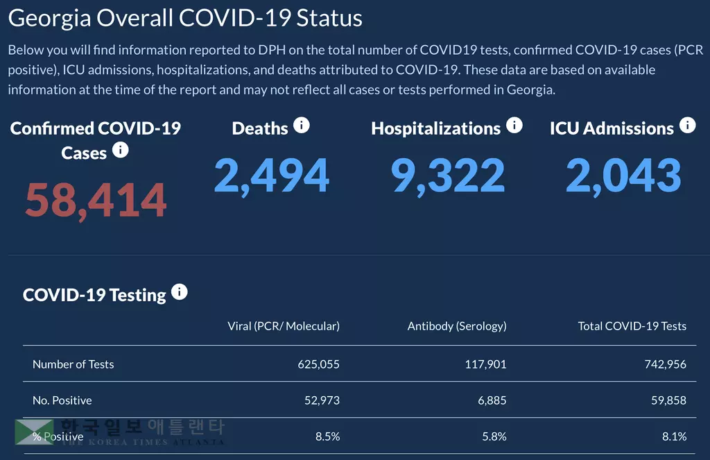 조지아에서는 총 74만2,956명이 코로나19 감염검사를 받아 7.86%가 확진 통보를 받았고, 항체검사는 11만7,901건이 진행됐다. 조지아주의 검사량 대비 확진률은 계속 하락하고 있다.