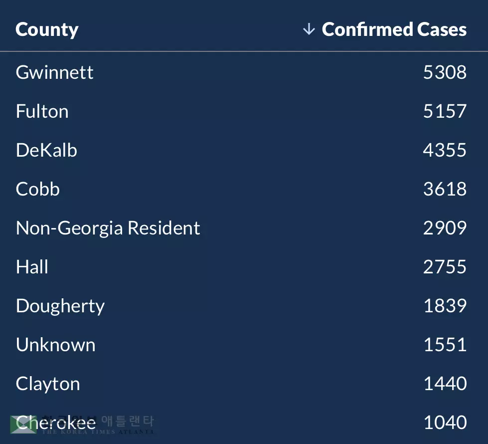 각 카운티별 감염자 수는 귀넷이 5,308명으로 가장 많았고, 풀턴 5,157명, 디캡 4,355명, 캅 3,618명, 홀 2,755명, 도허티 1,839명, 미상 1,551명, 클레이턴 1,440명, 체로키 1,040명, 머스코지 1,022명이다.