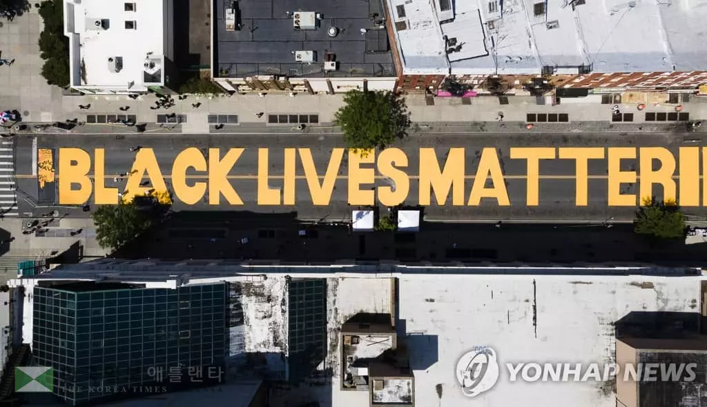 16일 뉴욕 브루클린 풀턴 스트리트에 '흑인 목숨도 소중하다' 문구가 큼지막하게 새겨져 있다. 뉴욕 거리에 새겨진 '흑인 목숨도 소중하다'