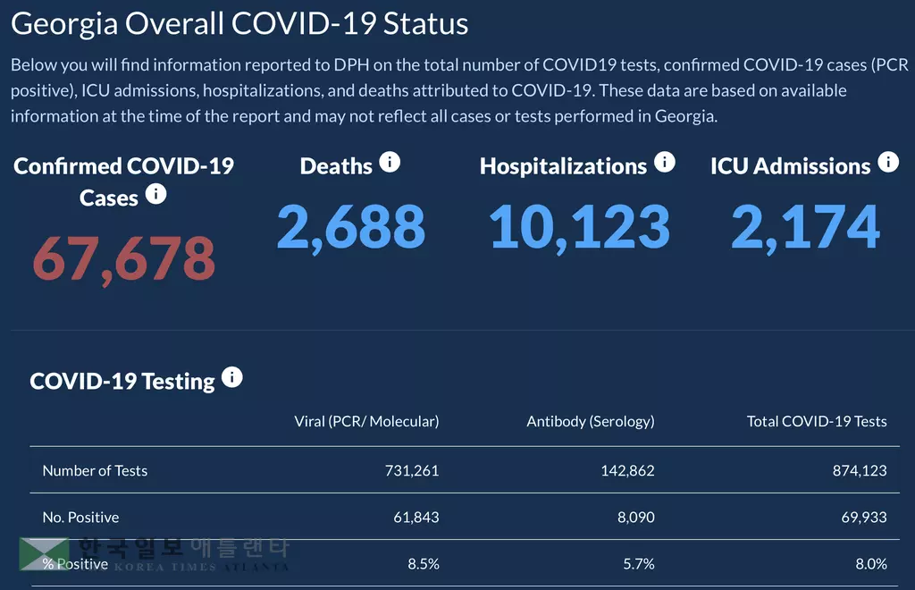 조지아주 보건부는 23일 오후 3시 현재 조지아주 코로나19 감염으로 인한 누적 사망자가 2,688명, 확진자가 67,678명이라고 발표했다. 확진자 치사율은 3.97%를 기록했다. 이는 22일 오후 3시 발표 보다 사망자가 40명, 확진자가 1,750명 늘어난 것이다. 감염자가 발생한 카운티는 159곳 전체에 이르렀다. 확진자 가운데 10,123명(14.95%)이 병원에 입원했으며 중환자실(ICU) 입원환자는 2,174명이다.