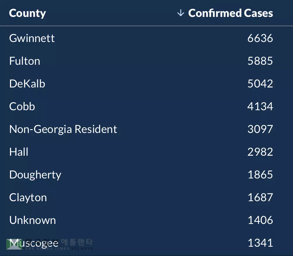 각 카운티별 감염자 수는 귀넷이 6,636명으로 가장 많았고, 풀턴 5,885명, 디캡 5,042명, 캅 4,134명, 홀 2,982명, 도허티 1,865명, 클레이턴 1,687명, 미상 1,406명, 머스코지 1,341명, 트룹 1,158명, 체로키 1,126명, 헨리 1,013명이다.