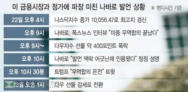 파문이 커지자 나바로 국장은 “내 말이 맥락에서 많이 어긋난 채 인용됐다”며 “현재 발효되고 있는 1단계 합의와는 전혀 관계가 없다”고 설명했다. 트럼프 대통령도 자신의 트위터에 사실이 아니라는 취지의 글을 올렸다.