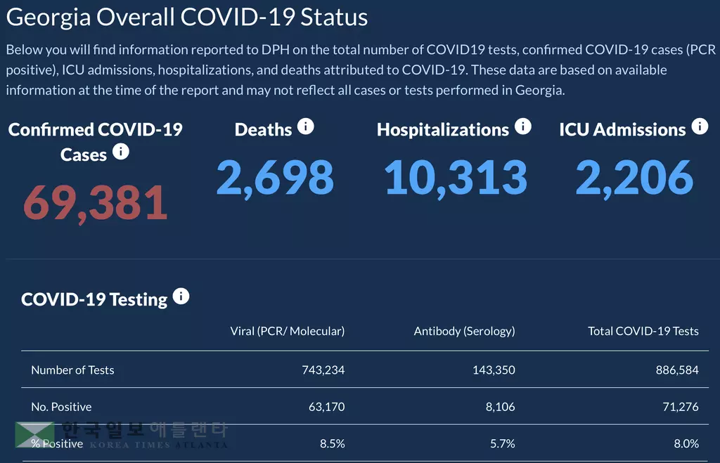 조지아주 보건부는 24일 오후 3시 현재 조지아주 코로나19 감염으로 인한 누적 사망자가 2,698명, 확진자가 69,381명이라고 발표했다. 확진자 치사율은 3.88%를 기록했다. 이는 23일 오후 3시 발표 보다 사망자가 11명, 확진자가 1,706명 늘어난 것이다. 감염자가 발생한 카운티는 159곳 전체에 이르렀다. 확진자 가운데 10,313명(14.86%)이 병원에 입원했으며 중환자실(ICU) 입원환자는 2,206명이다.