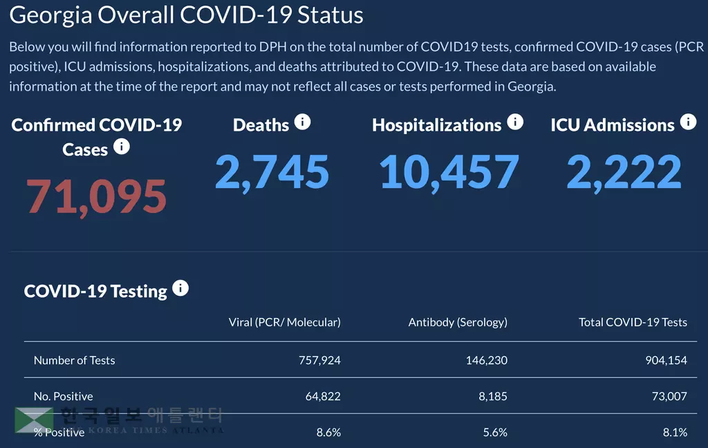 조지아주 보건부는 25일 오후 3시 현재 조지아주 코로나19 감염으로 인한 누적 사망자가 2,745명, 확진자가 71,095명이라고 발표했다. 확진자 치사율은 3.86%를 기록했다. 이는 24일 오후 3시 발표 보다 사망자가 47명, 확진자가 1,714명 늘어난 것이다. 감염자가 발생한 카운티는 159곳 전체에 이르렀다. 확진자 가운데 10,457명(14.70%)이 병원에 입원했으며 중환자실(ICU) 입원환자는 2,222명이다.
